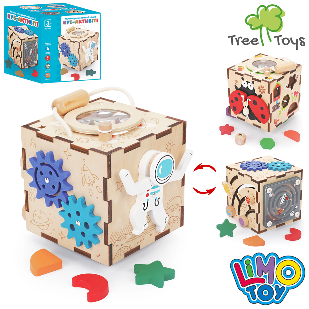 Дерев'яна іграшка Бізікуб MD 0894 (20шт) куб, 15,5-15,5-13,5см, сортер, шестерні, лабіринт, рухливі