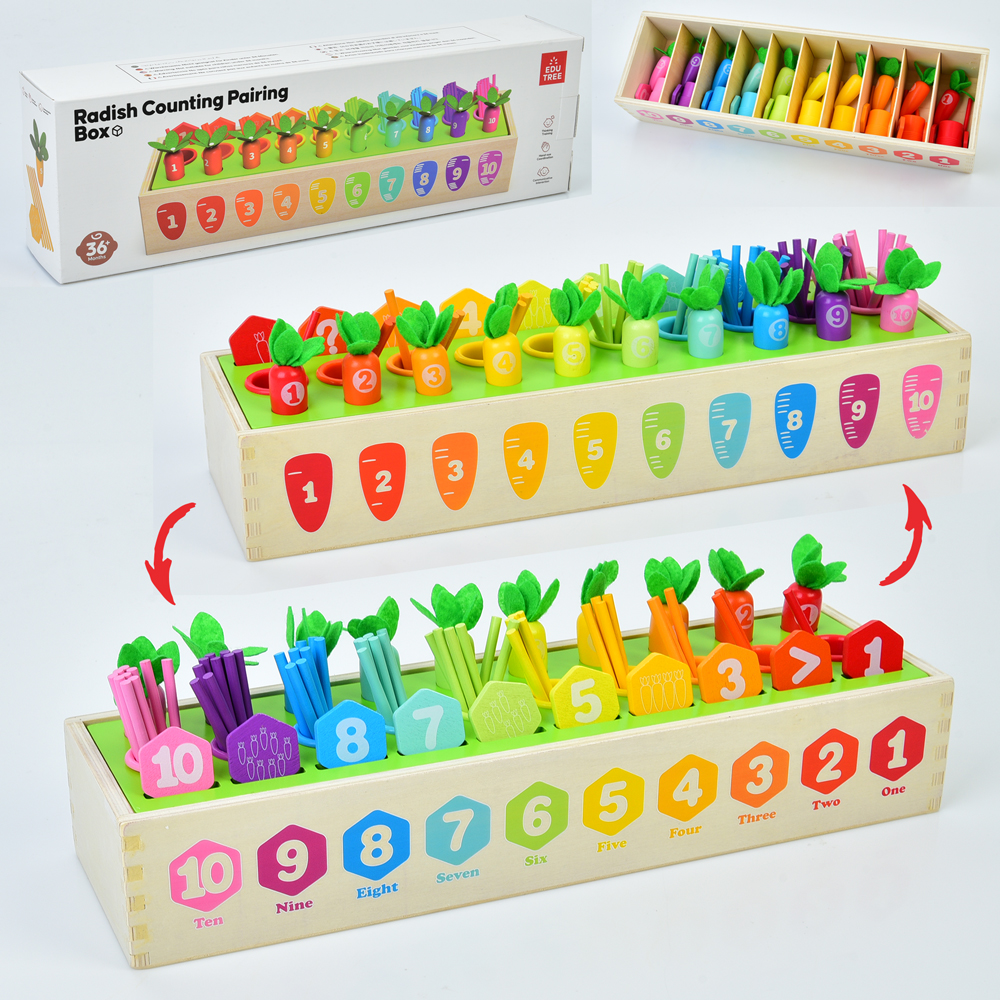 Дерев'яна іграшка Центр розвиваючий MD 0736 (12шт) навчальний, город(морква-різнокольорова з цифрами