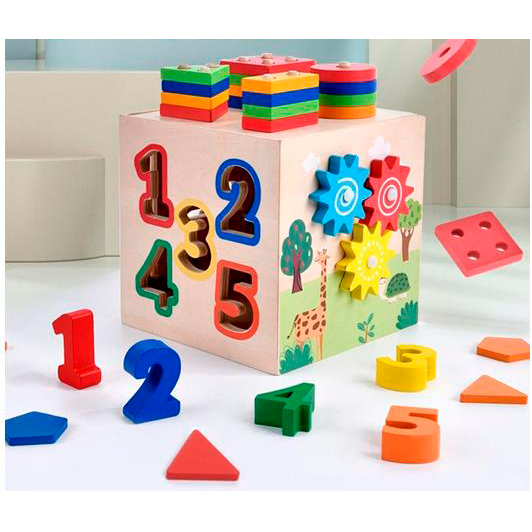 Дерев'яна іграшка Центр розвиваючий MD 0891 (9шт) куб, 14,5-15,5-14,5см, цифри 1-5, шестерні, геомет