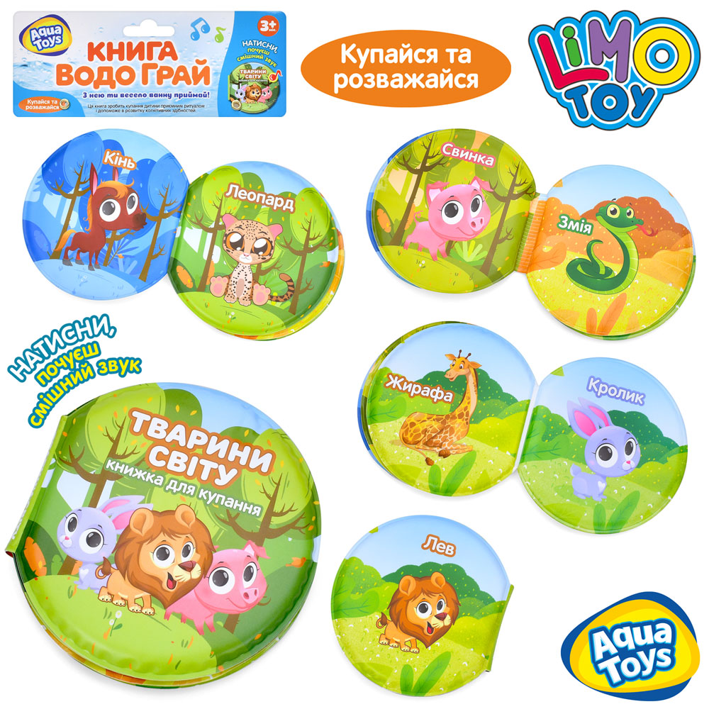 Гра для купання AQ 0002 (204шт) книжка, 13-13,5-2см, тварини, пискавка, назви тварин на УКР, у пакет