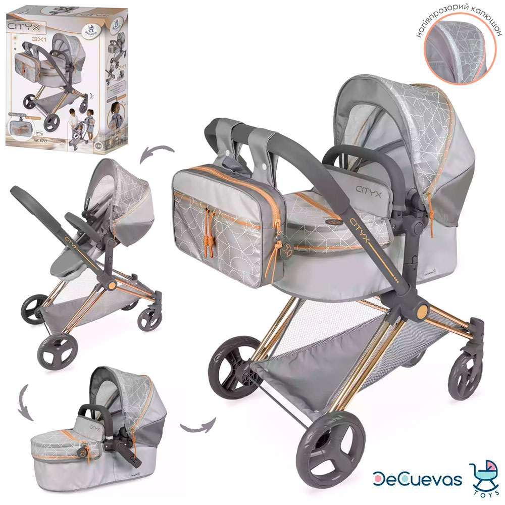 Коляска 81777 (3шт) для ляльки, класика, трансформер, 3в1, 65-38-в73см/в79см, колиска 49-23см, сумка