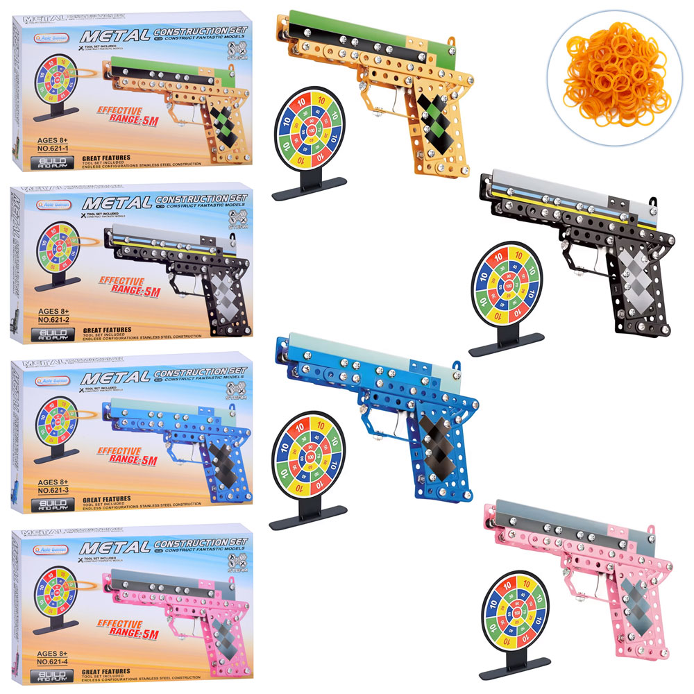 Конструктор 621-1-2-3-4 (36шт) метал, пістолет, мішень, резинки, наліпки, 4 види, в кор-ці, 31,5-20,