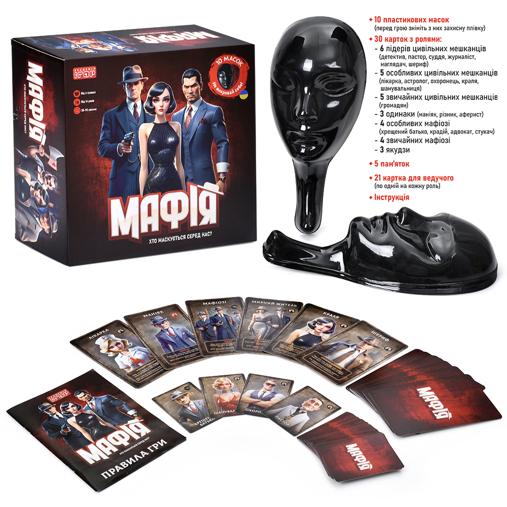 Настільна гра AI 001 (24шт) Мафія, маска10шт 35,5-15-9см, картки 30шт, картки дл я ведучого 21шт, ві