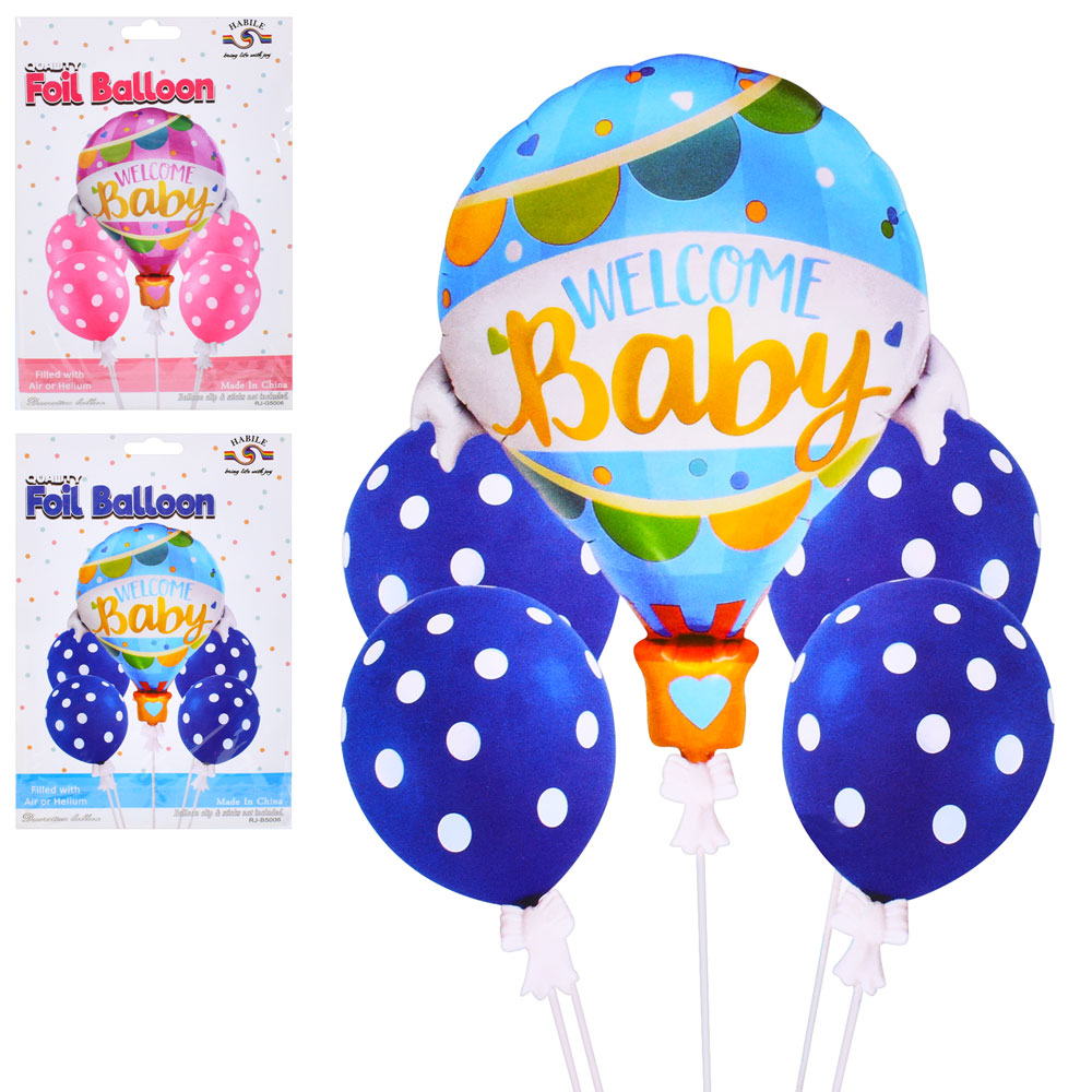 Повiтрянi кульки MK 5487 (100шт) Welcome baby, 5шт (1шт - 31дюйм, 4шт - 12дюйм), 2 види (рожевий, бл