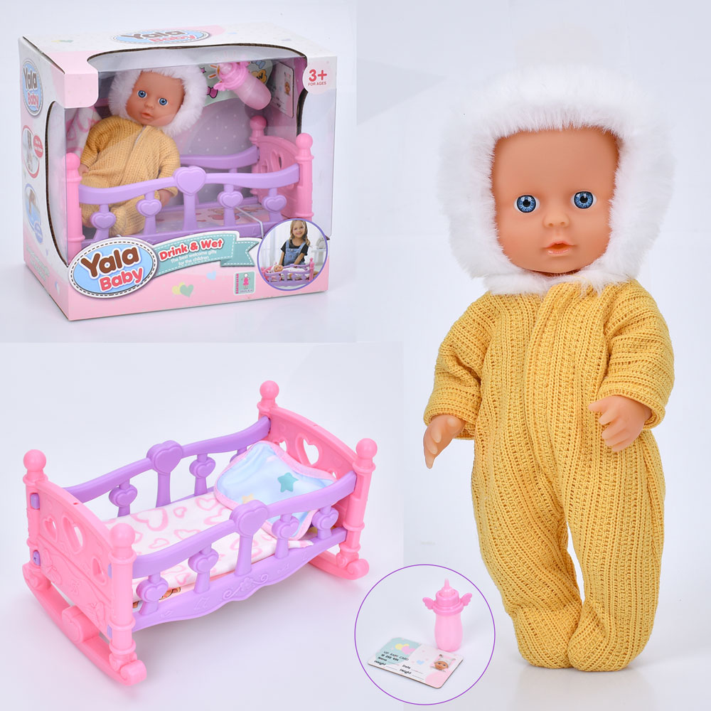 Пупс YL2420A-C (24шт) 21см, п'є-пісяє, ліжечко 24-14-14см, подушка, ковдра, пляшечка, в кор-ці, 25,5