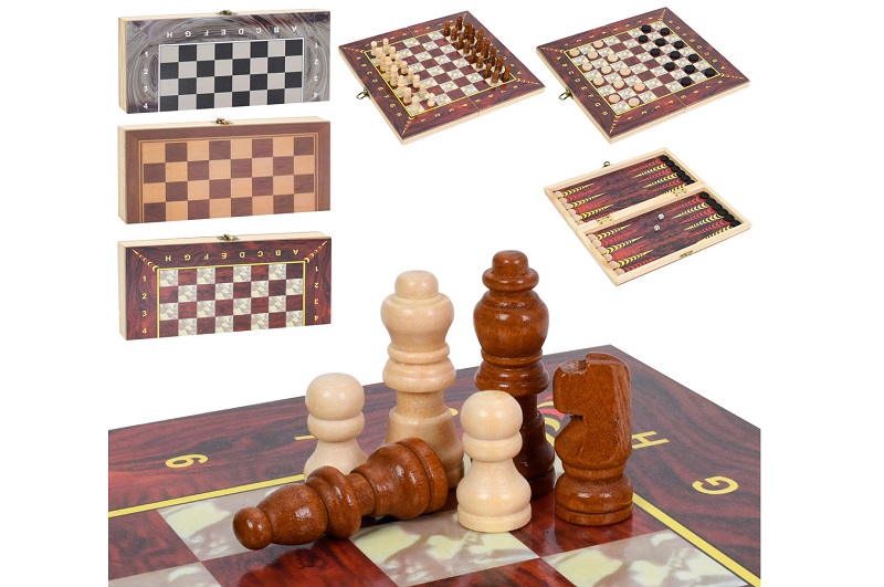 Шахи 28ACD (60шт) дерев, 3в1 (шашки, нарди), 3 кольори, в кульку, 27,5-14-3,5см