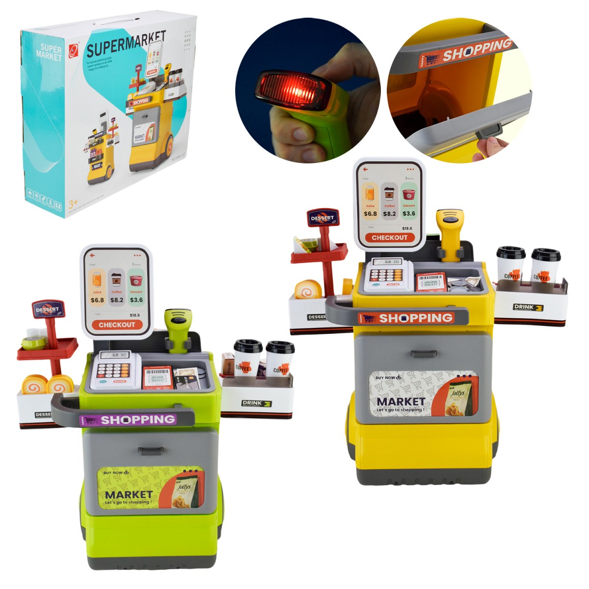 Супермаркет арт. 668-126/127 (12шт) батар. мікс 2 види, світло, звук, 46 деталей, стійка, каса, гро