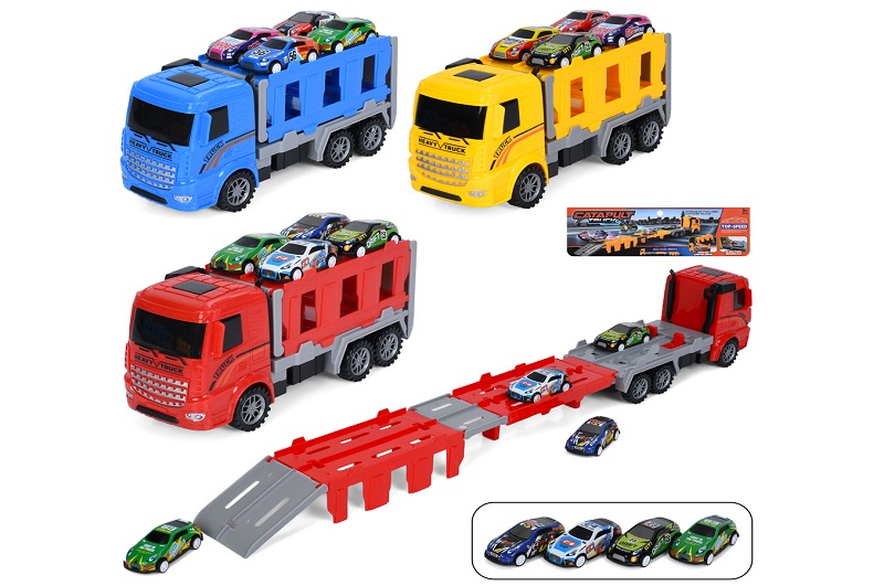 Трейлер 2090 (48шт) інерція, 24см, 2в1 (трек, 65см, запуск), машинка 7см, 4шт, мікс видів, у пакеті,