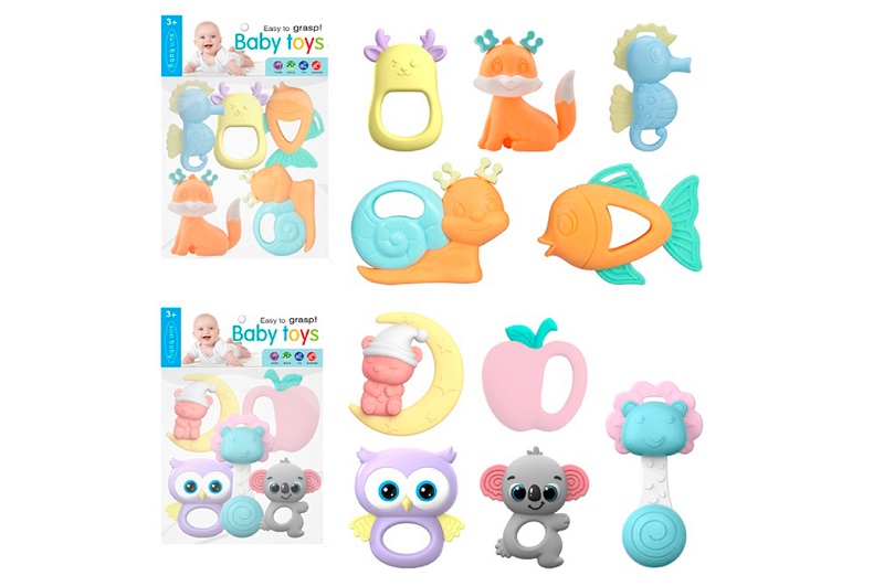 Брязкальце 009-2-3 (48шт) набір 5шт (тварини), від 8см, прорізувач, 2 види (морські мешканці, яблуко