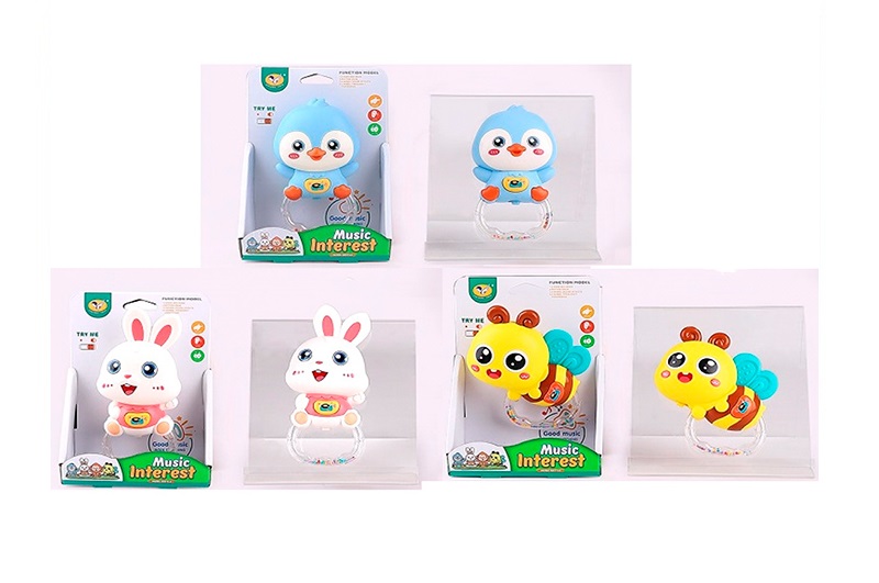 Брязкальце 855-187D-188D-190D (72шт) 13см, музика, звук, світло, 3 види(пінгвин, зайчик, бджола), на