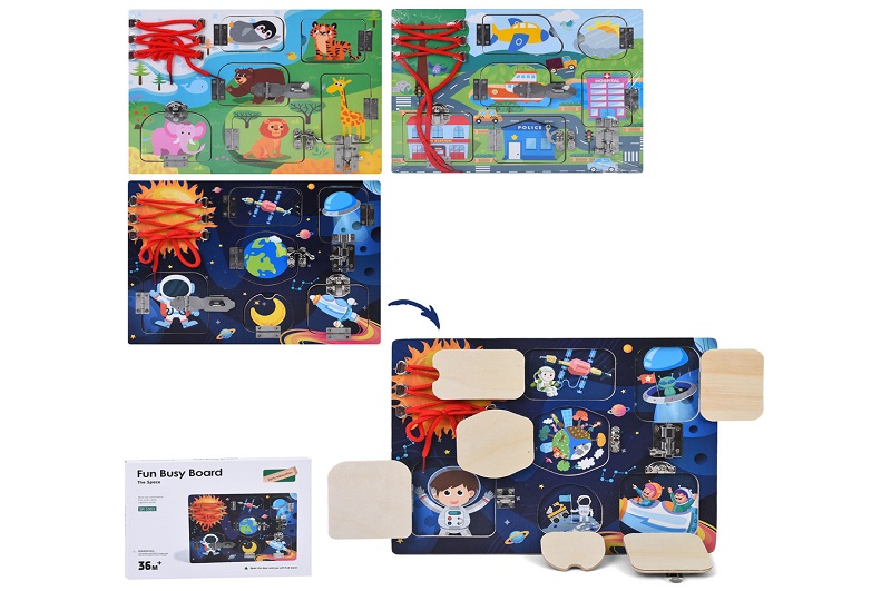 Дерев'яна іграшка Бізіборд MD 0146 (18шт) ігрове поле 30-22,5см, шнурівка, замки/засуви(метал), рухл