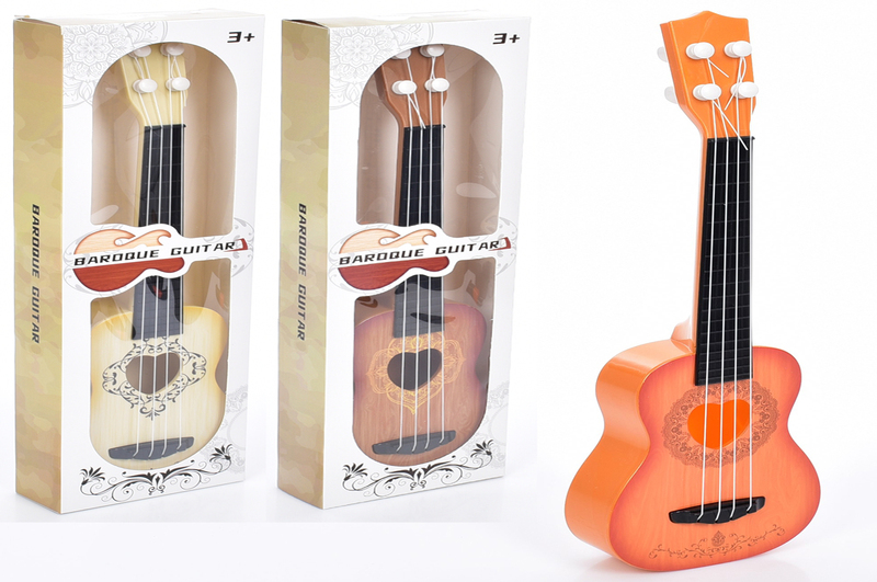 Гітара 8826 (60шт) 45см, струни 4шт, 3кольори, в кор-ці, 45-14-6см