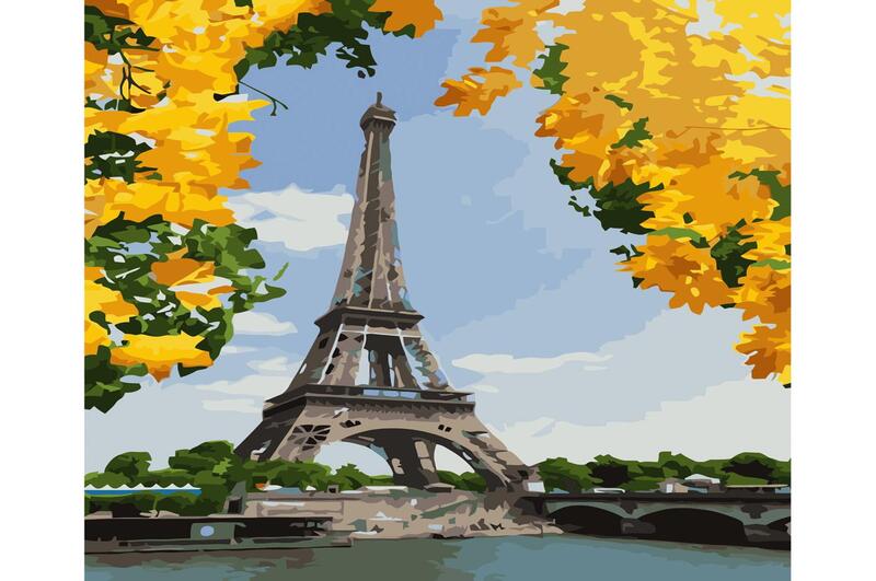 Картина по номерах Ейфелева вежа в жовтому листі Strateg з лаком та рівнем розміром 40х50 см VA-3589
