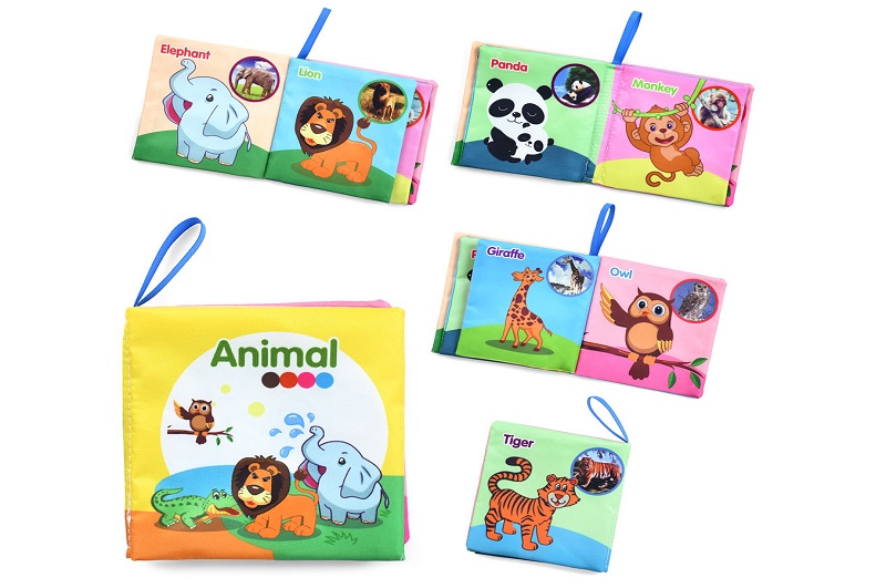 Книжка 316 (300шт) тварини, 11-11-2см, петелька, шуршить, тканина, назви на англ., пакет, 11-11-2см