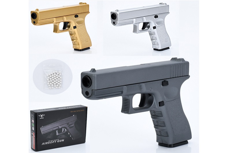 Пістолет V20 (18шт) 20см, пластикові кулі, метал+пластик, мікс кольорів, 1ящик-1колір, в кор-ці, 23-